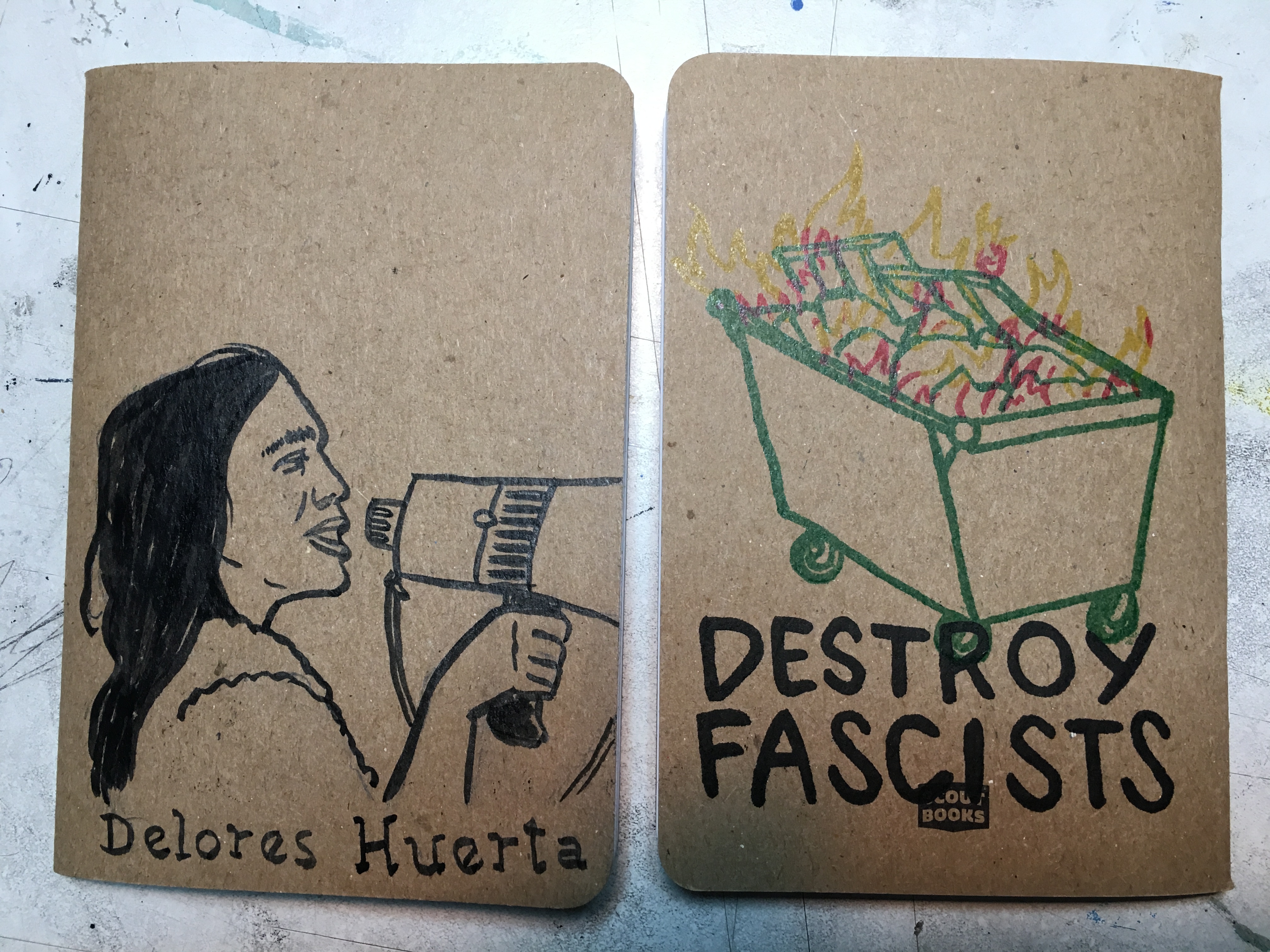3.5 x 5 in / 32 blank page notebook featuring original ink drawing of Delores Huerta. Destroy Fascists print on reverse.